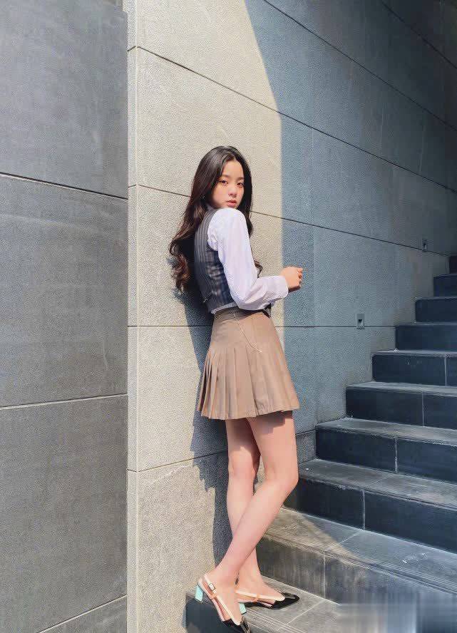 同样是百褶裙,但颜色和搭配单品不同,就会展现不同的视觉效果。欧阳娜娜穿着白衬衫配浅棕百褶裙,多了几分淑女感,脚穿拼色低跟鞋,比小白鞋增加淑女的气质。整体造型很优雅大方,也可以作为上班族的通勤装扮。